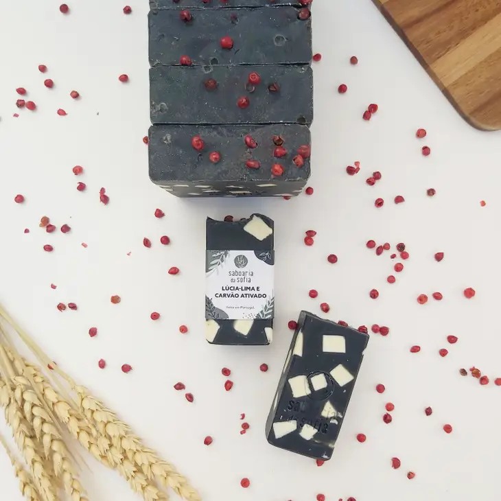 Sabonete artesanal de base vegetal, aromatizado com óleo essencial de Lúcia-lima e Carvão Ativado. Bom para detoxicar. 60 gramas.
