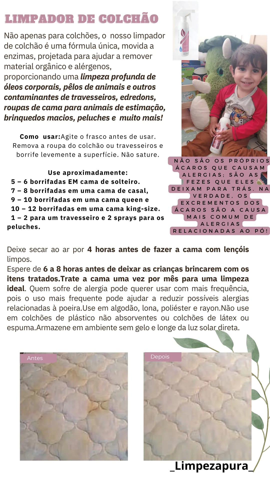 O nosso limpador do colchão está em promoção este mês e acreditam quando digo que TODOS precisamos de um nas nossas vidas!Ele contém enzimas e ingredientes biodegradáveis que ajudam a remover materiais orgânicos e alérgicos, proporcionando uma limpeza profunda de óleos corporais, pelos de animais e outros contaminantes de colchões, travesseiros, edredões, roupas de cama para animais de estimação, brinquedos macios, móveis de tecido, peluches etc. Por falar em peluches, Você sabia que 80% dos bichinhos de pelúcia abrigam bactérias nocivas e 1 em cada 4 está contaminado com fezes . Yuck! É por isso que é melhor refrescar cum o nossos spray de 3 em 3 meses.
